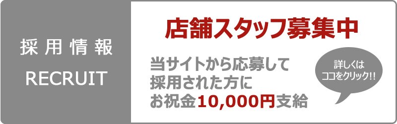 店舗スタッフ募集中 こちらの採用ページよりご応募頂いた方に限り 入社後にお祝金1万円を差し上げております。 |