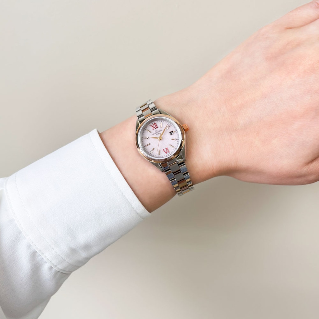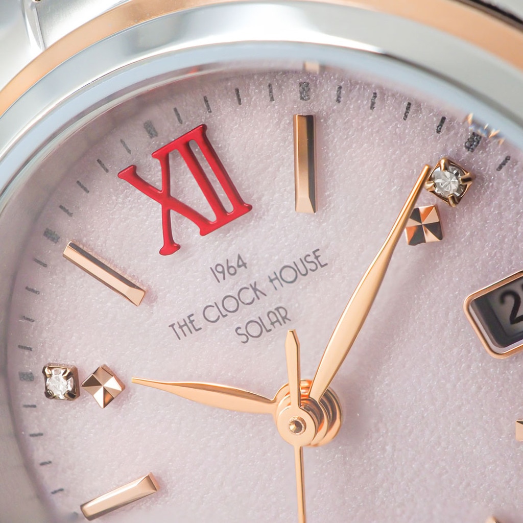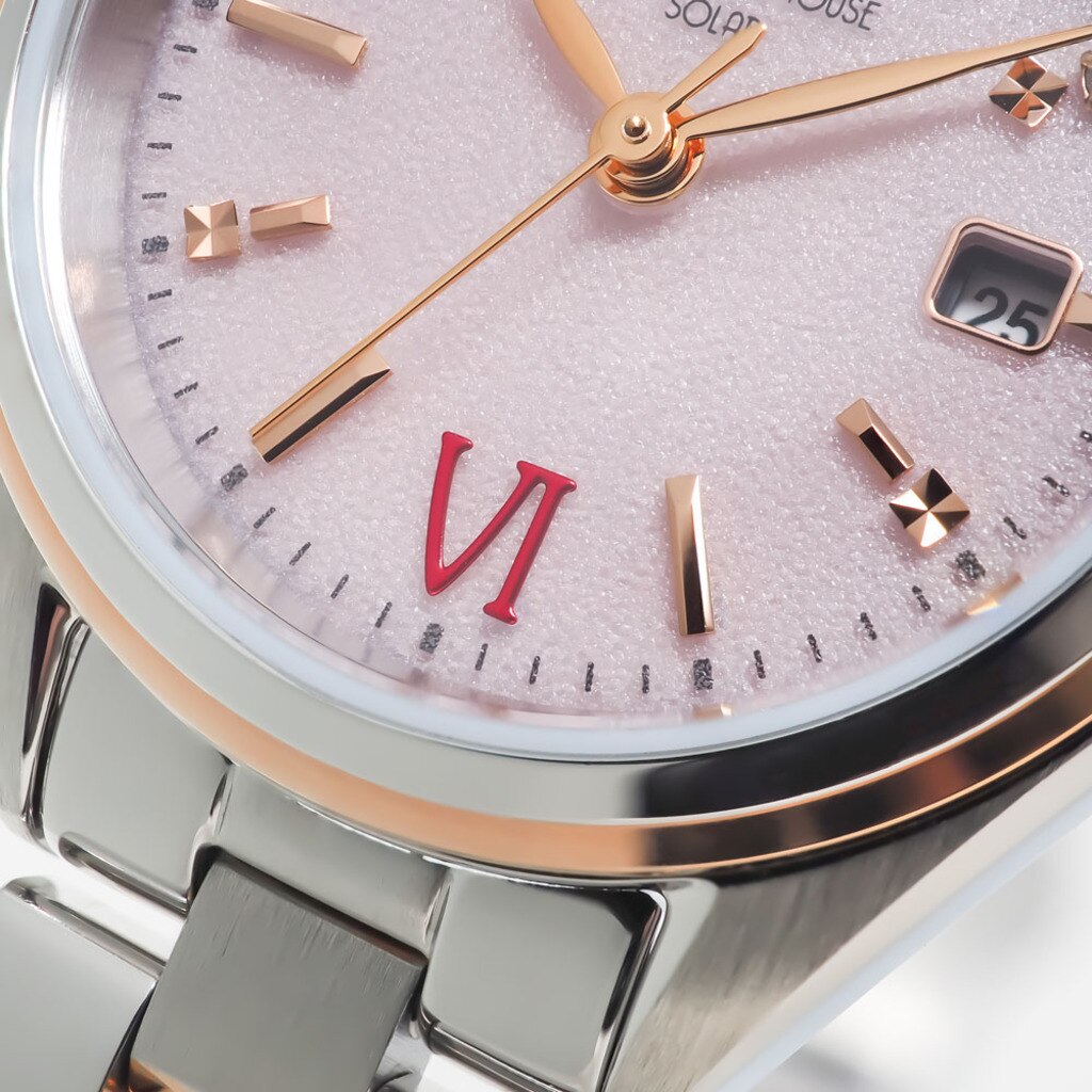 12時と6時のインデックスには、深い愛情やぬくもりをイメージしたディープレッドをあしらい、やさしい印象のうすピンクの文字盤のアクセントにしました。一日の節目となるタイミングを「これまで」と「これから」に重ね、日々の感謝の想いを表現しています。