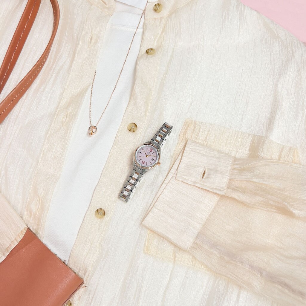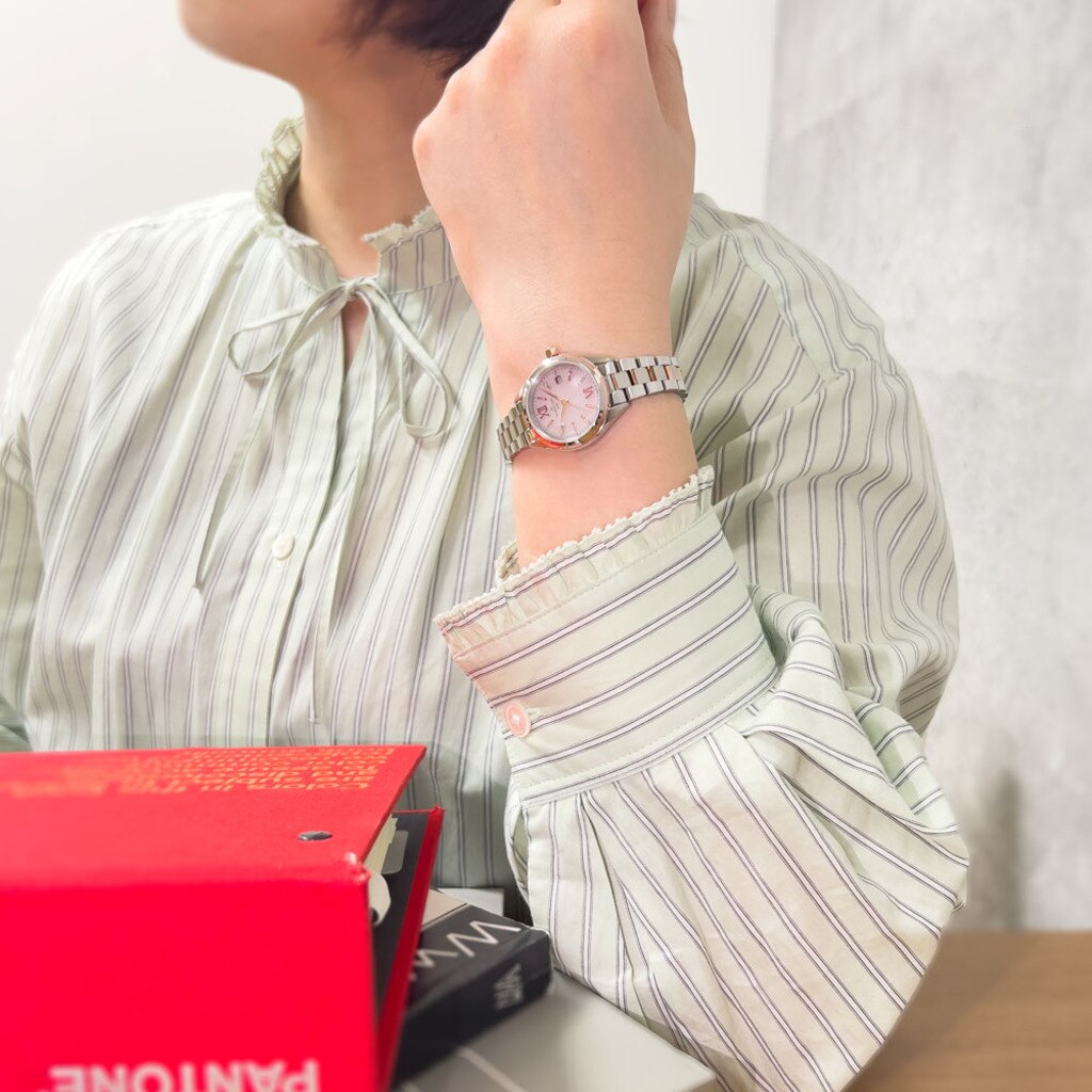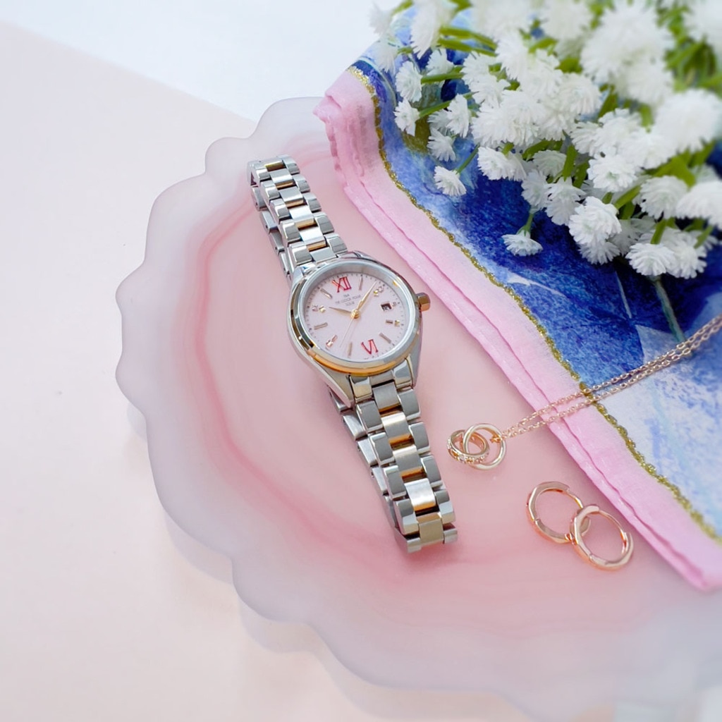 12時と6時のインデックスには、深い愛情やぬくもりをイメージしたディープレッドをあしらい、やさしい印象のうすピンクの文字盤のアクセントにしました。一日の節目となるタイミングを「これまで」と「これから」に重ね、日々の感謝の想いを表現しています。